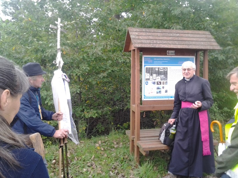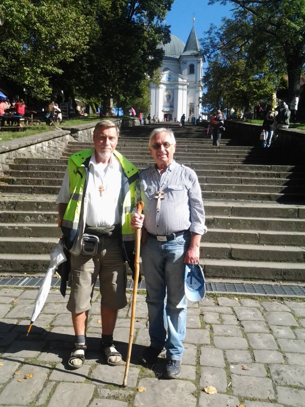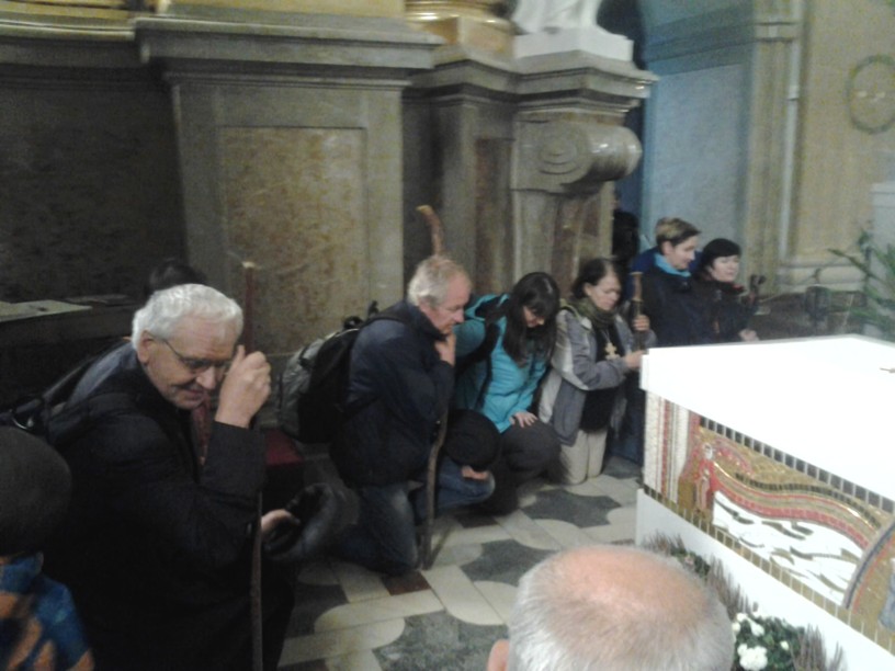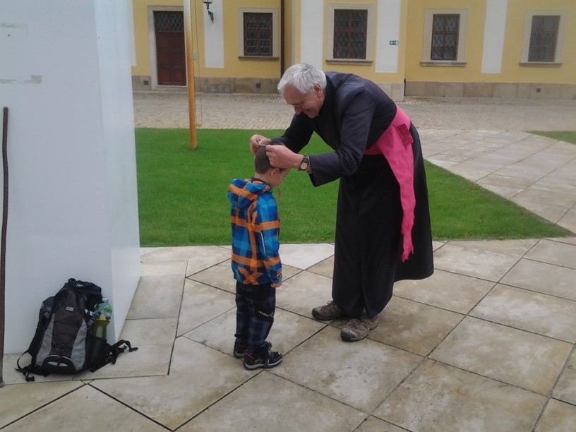 Z posvátného Velehradu nás v pátek 26.9. v pravé poledne po modlitbě Anděl Páně před svatostánkem vyšlo 17. Nejprve jsme prosili za jednotu a mír u Matky Jednoty a Královny pokoje, pak jsme se modlili u hrobu tatíčka Stojana  a kardinála Špidlíka. U papežského kříže dostal poutnický kříž nejmladší z nás, předškolák Cyril, který šel jen první den s tatínkem - místopředsedou Matice.
