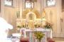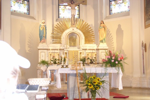 Mše svatá: hodně kněží, slouží o. Jindřich Bartoš, evangelium čte jáhen Ladislav Kinc,káže poutník o. Ludvík Bradáč